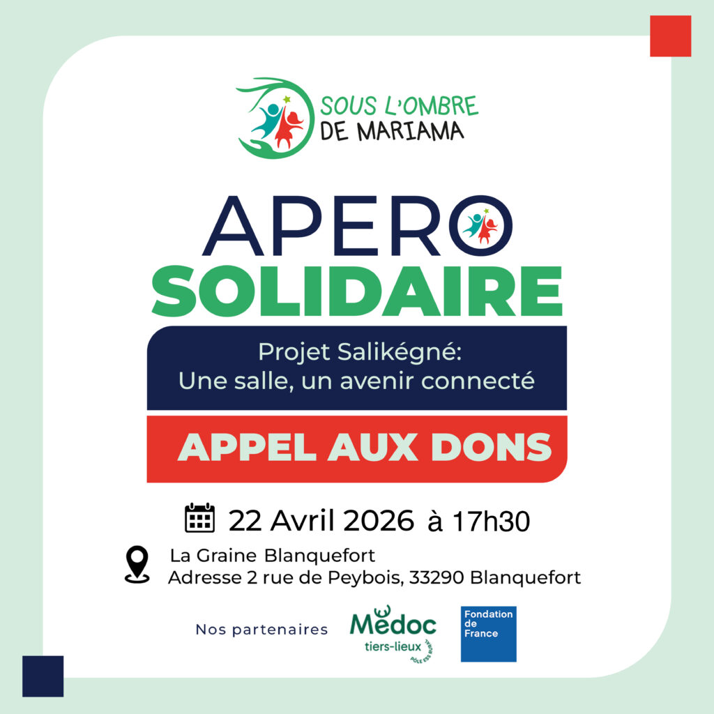 👉 Inscription ouverte jusqu’au 15/04/2026 (gratuite mais recommandée) : https://www.helloasso.com/associations/sous-l-ombre-de-mariama/evenements/apero-solidaire